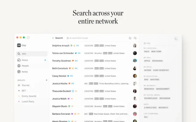 You remember people in different ways—where you last met to catch up, when you last saw them, what you talked about. Just type what comes to mind and Clay will find the right person or group of people based on your notes and their profile, all in milliseconds. It's the easiest, most powerful person search available anywhere.