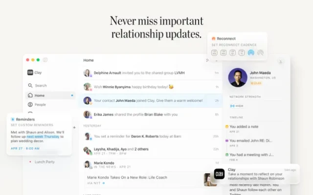 Clay helps you show up informed by creating and automatically updating beautiful cards for each of your contacts with context such as profile photos, bios, education and work history, location, and social profiles. In addition, you can use powerful features such as natural-language search, dictation and note taking, reminders, birthday notifications, news articles about people you know, reconnection cadences, and more to deepen your relationships over time.