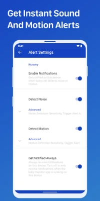 Get notified on your Parent Unit device with our sensitive noise and motion alerts when your Baby Unit device detects that your little one is waking up, babbling, or crying.
