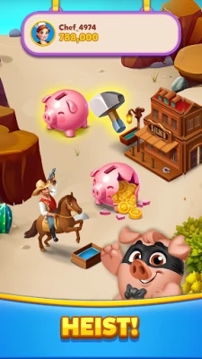 Attack or raid friends and upgrade your restaurant with your golden coins. Revenge for heists to fill your piggy bank and prevail over competitors. Spin to win!