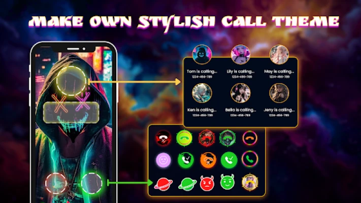Customize call themes by choosing from a variety of themes in this app's collection or your photo library and combined with unique avatars. Change your call acceptance and rejection icons for a distinctive touch. Let's craft your individualized caller screen theme!