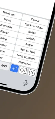 24 categories available for comments e.g. portrait, travel, black-and-white, winter or long-exposure. Each category has more than 40 different comments which can be extended with individual smileys and symbols.