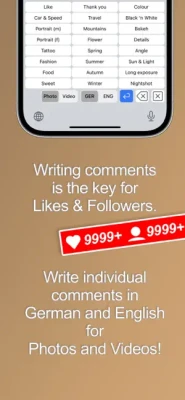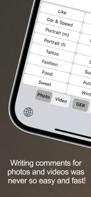 This App will help you to easily and quickly create individual comments for photos or videos on any Social Network or Photo Platform!