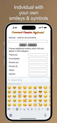 Extend the comments individually with smileys and symbols. You can choose the smileys and symbols which you like and identify with. Enter as many as you want in the settings, the app will randomly add some to the comments.