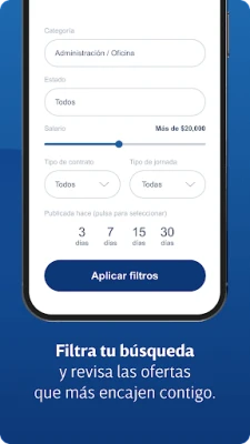 Filtra en la aplicación las ofertas de empleo según ubicación y cargo o área profesional, y verás aquellas que mejor se adapten a tu perfil de trabajo.