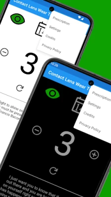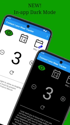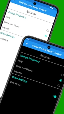 Users can now choose the frequency in which they change their contact lenses. Users can choose between Daily, Every Two Weeks or Monthly. Simply click your preference in the Settings menu and the color indicator (eye icon) will change appropriately to reflect the new schedule. This change schedule is indicated by the calendar icon on the main screen. It will display either a "1", "14" or "30" depending on your chosen change frequency.