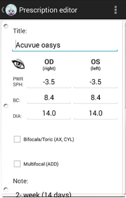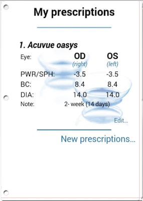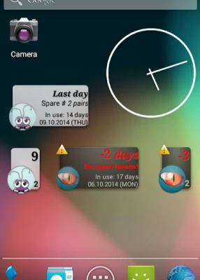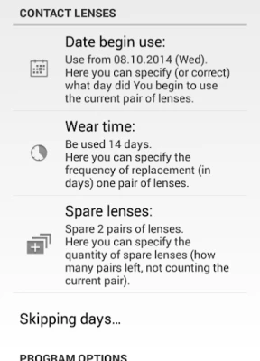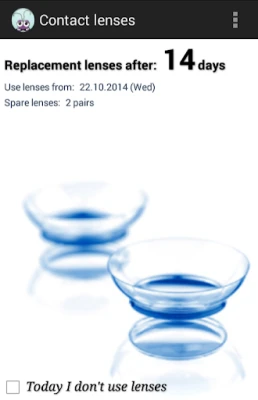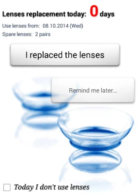 + Replacement lenses in one touch + Conserve battery, runs as needed + Skip days function (when you are not used lenses) + Two types widget + Counts spare lenses + Snooze reminder (for an hour or two, until the evening or until tomorrow) + Stores your prescriptions + Automatic skip days (if you want to discontinue use for a few days)