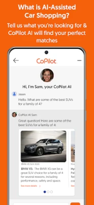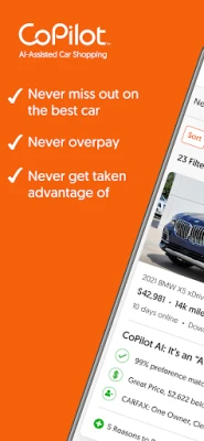 Shop with confidence with CoPilot’s AI-Assisted car shopping app for new and used cars, trucks, minivans, SUVs, EVs & hybrids. CoPilot searches every car at every dealer, every day, pulls together all the information in one place, analyzes every car in seconds, and ranks them based on what matters to you.