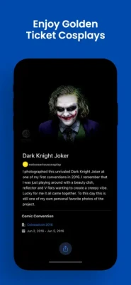 The app lets you easily share your favorite Golden Ticket cosplays, and conventions with friends via messaging platforms.