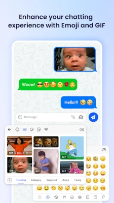 - Spice up your chats with a wide range of GIFs, perfect for every mood and moment.