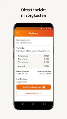 Nota van een zorgverlener voorgeschoten? Declareer je kosten in een paar simpele stappen. Stuur ons gewoon een foto of pdf van je nota. Wij doen de rest. Meer info nodig over je zorgverzekering of zorgverbruik? Vind het antwoord in de app! Met je mobiele telefoon, waar en wanneer je maar wilt.