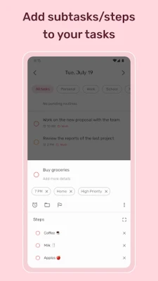 Each task has a list of subtasks/steps that can also be prioritized, reordered, and have reminder.