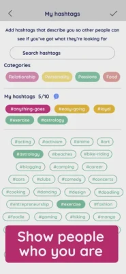 Spice up your profile with unique hashtags to share your likes, hobbies, favorite foods, music preferences and much more