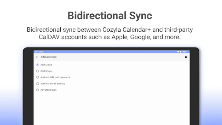 - Bidirectional Sync: Enjoy the power of bidirectional synchronization between Cozyla Calendar+ and third-party CalDAV accounts such as Apple, Google, and more.