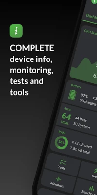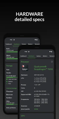 Monitor your hardware in real time and get complete information about your device model, CPU, GPU, memory, battery, camera, storage, network, sensors and operating system. DevCheck shows all the information you need about your hardware and operating system in a clear, accurate and organized way.
