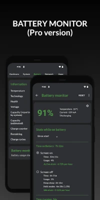 Battery: real-time info about your battery status, temperature, level, technology, health, voltage, current, power and capacity. With Pro version, get details about battery usage with the screen on and off using the Battery Monitor service.