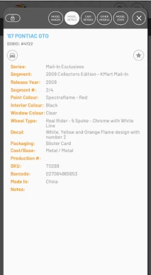 Search and manage your Diecast collection on the move. Thousands of Hot Wheels, Matchbox and many other brands already added to a fast growing database. All database models are first researched and verified before being added to the database, ensuring you have access to the highest quality data. If your model is not in our database, you can add your own and when we have been able to add it to our database, it will sync with your model and populate any missing information.