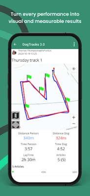 With DogTracks, tracking becomes a breeze. Start by walking the track and strategically placing your articles. As you progress, the app keeps you informed with essential data. You'll see a detailed map of your track, including the location of your articles. Plus, a handy summary reveals the track's length, the number of articles placed, and the time you spent on your adventure.
