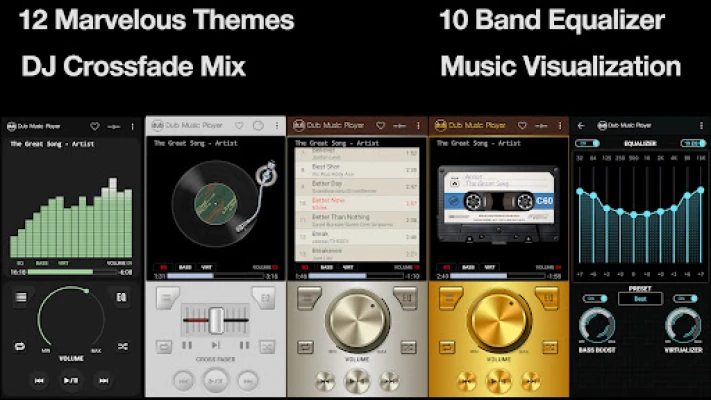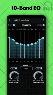 Dub Music Player is a powerful music player with built-in 10-band and 5-band equalizers and numerous audio effects to enhance the quality of music playback and listening experience.