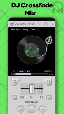 Dub Music Player's music visualization employs effects like music spectrum bars, circular bars, VU meter, vinyl record turntable, tunnel, and wrap. The app also facilitates song mixing through a built-in crossfader, with an option for automatic mixing through crossfade.