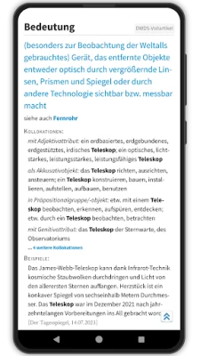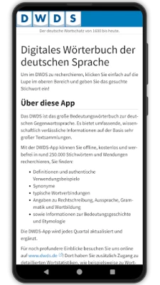 Diese App ist die Offline-Version des Portals www.dwds.de, auf dem Sie zusätzlich auf Wortstatistiken, Bild- und Audiomaterial, Glossare und redaktionelle Beiträge zugreifen sowie in umfassenden Textkorpora und weiteren Wörterbüchern recherchieren können.