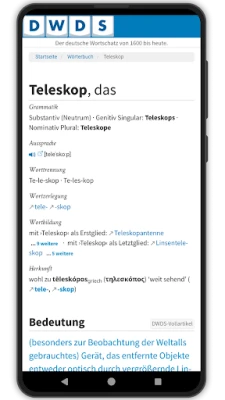 Für Schreibende, Lernende, Lehrende und Sprachinteressierte: Das Digitale Wörterbuch der deutschen Sprache (DWDS) ist das große Bedeutungswörterbuch des Deutschen der Gegenwart. Es bietet umfassende und wissenschaftlich verlässliche lexikalische Informationen, kostenlos und werbefrei. Mit der App können Sie jederzeit offline Definitionen, Verwendungsbeispiele, Angaben zu Schreibung, Grammatik und Etymologie sowie Synonyme und typische Wortverbindungen zu rund 260.000 Stichwörtern und Wendungen nachschlagen – von A wie „a cappella“ bis Z wie „zürnen“.