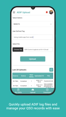 Easily upload additional logbook data in ADIF format into your DxQSO cloud logbook. You can set up different stations in your cloud logbook to distinguish between home operations, contests, POTA, remote, or mobile operation. Assign custom tags to ADIF uploads to comment on special events or indicate unique situations. Additionally, you can query your contacts by station or tag.