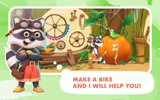 An inventive raccoon came up with an eco-friendly bike for his friend the elephant. Help him sort parts, build a bicycle, inflate eco-friendly tires and add decorations.