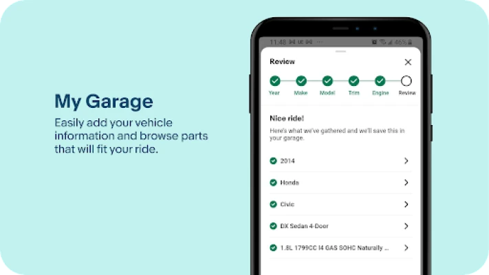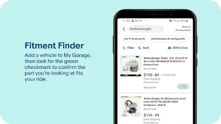 After you've added your vehicle to My Garage, check out eBay’s Fitment Finder. It gives you the confidence that the parts you buy on the eBay Motors app will fit your vehicle. Look for the green checkmarks to quickly pick out the right part for your ride.