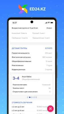 Приложение ED24.KZ стремится объеденить все виды организаций образования на одной площадке. И предоставить родителям удобные инструменты для поиска и изучения информации о детских садах, кружках, секциях и школах. По мере развития приложения будут добавляться возможности получать государственные услуги, полезные уведомления, и много других инструментов.