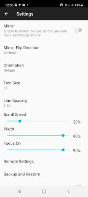 - "Specific Settings" is added where each script can have its own settings (speed, line spacing, text size, focus and width). This option is very helpful for musicians and singers.