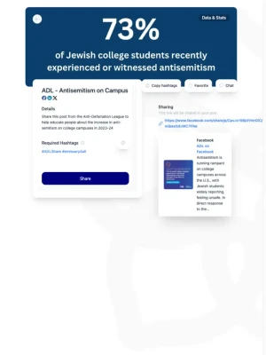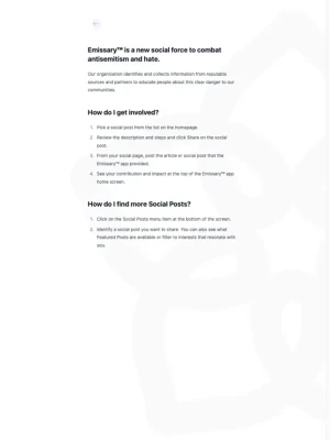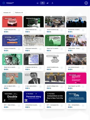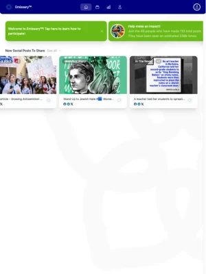 Emissary is a non-profit advocacy platform that facilitates social media posting for people desiring to combat antisemitism and fight against hate speech. The free platform invites all users no matter their religious or political inclinations. Users can choose from a wide variety of timely topic categories, select content with sources identified, and post to their own social media accounts. Emissary curates social content from credible sources, making it readily available to individuals and organizations for mass distribution.