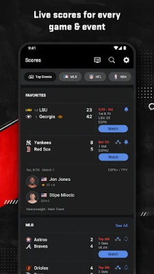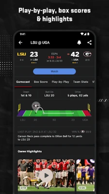 Highlights and scores from what you care about. From news about your favorite sports or team playing right now, the home tab has you covered. Fast access to scores for your favorite teams and leagues and the top games of the day in the scores tab. Also, subscribe to your favorite ESPN Podcasts or listen live to ESPN Radio.