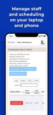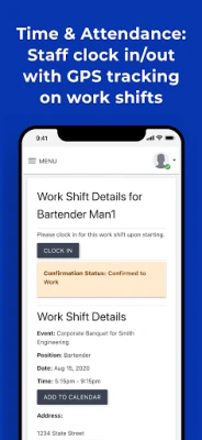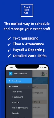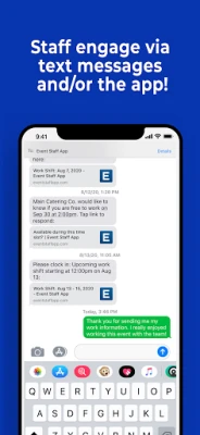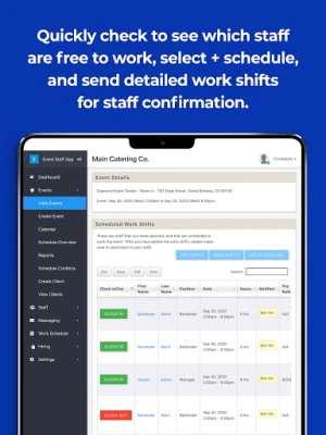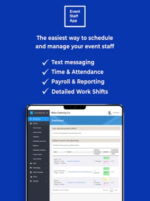 Event Staff App helps you automate the work around scheduling, managing, and communicating with your staff. Figure out which of your staff is free to work via text messages. Easily schedule your staff and communicate all work shift details. Have your staff clock in & out via the app, and then export the timesheet data to your payroll platform. Businesses that use our software cut down on 80% of the management time that they spend with their staff each week.
