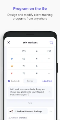 Everfit for Coach allows fitness coaches to: Manage clients on the go Direct message clients Customize exercises and create workouts Assign training and log workouts Track body metrics, progress photos, and notes