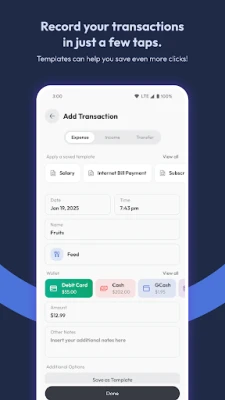 • Record your income, expenses, and money transfers in seconds!
