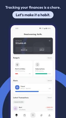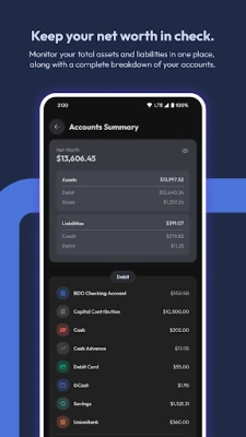 • View your net worth, assets, and liabilities along with a detailed and customizable breakdown of your accounts.