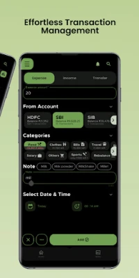 • Easy Transaction Management: Quickly add transactions with details like amount, type, account, category, date, and time. Edit or delete with ease, ensuring accurate records.