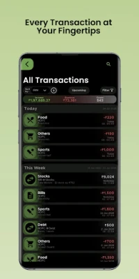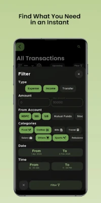 • Comprehensive Search and Filter: Search transactions or filter based on any detail. Sort by date or amount for a better financial overview.