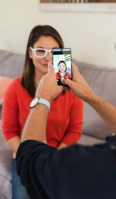 Measure your pupillary distance in three easy steps: Put on your PDCheck Frames Take a selfie (or ask a friend to take a picture of you) using the PDCheck App Adjust the markers to the center or your pupils AND frames