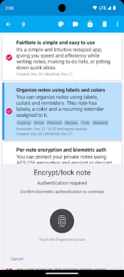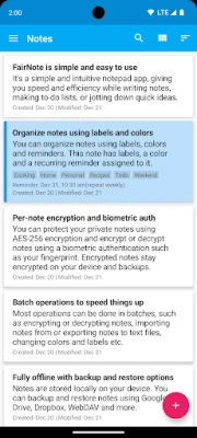FairNote is a simple and intuitive notepad app, giving you speed and efficiency while writing notes, making to-do lists, or jotting down quick ideas. You can organize notes using labels/tags and different colors, use reminders to keep better track of your tasks, protect sensitive data using industry-standard encryption, and best of all, if your device supports biometric authentication, you can conveniently use that to encrypt and decrypt notes without having to enter your encryption password every time.