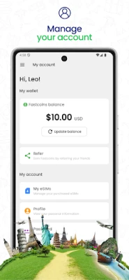 Easily create an account and keep full control of your purchased eSIMs. With real-time management, you can monitor your data usage for each eSIM. You can also generate your own referral code to earn Fastcoins and redeem them on future purchases—save while you travel!