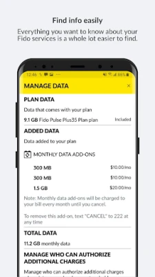 • View your bill, and save/print a PDF with full details • Make a secure payment with your Credit Card on-the-go • Get 5 EXTRA hours of data – 1 hour, 5 times a month, with all Fido PulseTM plans • Manage your travel options • Edit your contact information and billing address without calling us • Change your method of payment in just a few taps • Switch up your add-ons straight from your phone! • Check your network status with Network Aid