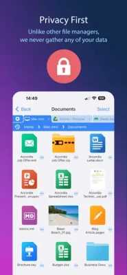 View Microsoft Office, Apple Pages, Numbers, KeyNote, PDF, text files, source code, HTML, and many more using the built-in viewers.