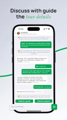 Contact people in the chat or wait for them to say hello first. Together with a guide, you can plan a trip itinerary and discuss your travel preferences.