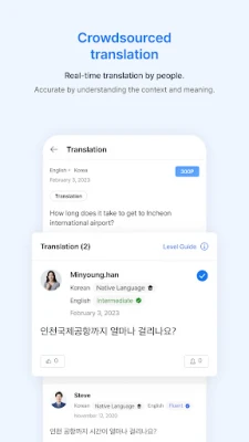 Crowdsourced translation service is available only from Flitto! This 'human translation' service, powered by over 10 million users in 173 countries all over the world, will give you translation results in just 3 minutes on average.