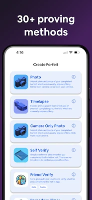 • Photo - Take a photo of the task that you completed, and an AI will verify if your photo matches your description. Examples: At the gym, inbox zero, Duolingo completed.