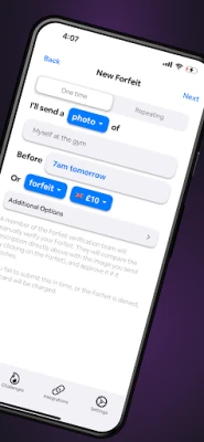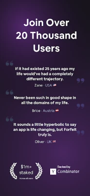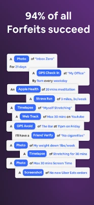 Forfeit: Money Accountability Complete habits or lose money Forfeit is an accountability app that takes your money if you don't complete your habits. We're based on the scientifically backed concept of Habit Contracts - popularised by Atomic Habits - that losing money is highly motivational. Out 20k+ users have achieved a 94% success rate on over 75k forfeits, staking over $1m dollars.