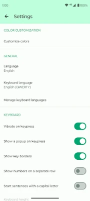 Tailor your typing experience by toggling vibrations, popups on key presses, and selecting your preferred language from the list of supported ones. Personalize your keyboard settings to suit your preferences.