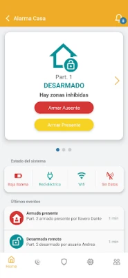 Esta sección de la app permite ver el estado de zona (abierta, cerrada, inhibida o en alarma) con sus colores característicos para una mejor y rápida identificación. Cada zona admite la personalización del icono que se elige desde una amplia galería disponible.